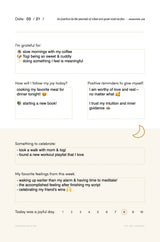 - Goals and Reminders: Start your day with what you’re grateful for, what you’ll focus on, and a positive mindset. End the day with something to celebrate, alternating daily prompts, and a joy tracker.